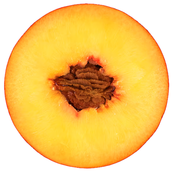 The peach tree (Prunus persica) belongs to the Rosaceae family and has been cultivated in China and Iran since Antiquity, brought to Europe by the Romans. Its fruit (the peach) has a fleshy exterior surrounding a hard shell that stores the kernel. There are hundreds of varieties of peaches with fuzzy skin ranging from white and yellow to red.