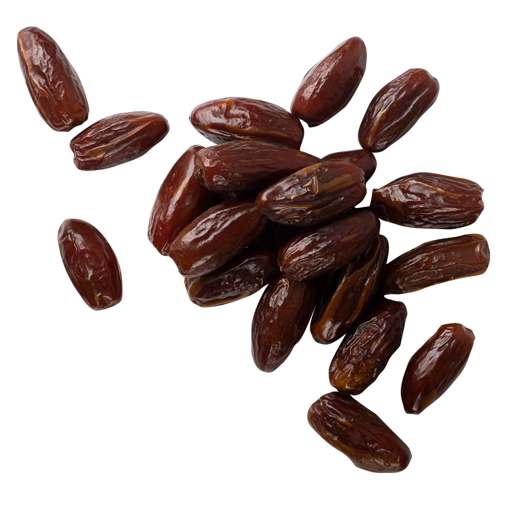 There are several kinds of dates, ranging from cylindrical to finger-shaped and varying in sweetness, colour, and texture. Dates are generally around 50% sugar and contain fibre, as well as some protein, vitamins, and minerals. Palms begin to bear fruit at around 4-5 years and are at their most fruitful at around 10-15 years of age, producing up to 80kg of dates each per year.
